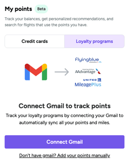 Our Gmail Sync features connects your Gmail account to point.me so we can automatically scan your inbox for loyalty program emails (such as monthly mileage statements or balance updates) and extracts. your current points balances.