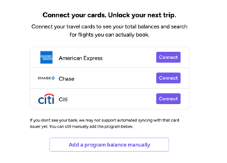 - For Credit Cards, you can manually sync your points if you are a American Express, Chase, or Citi cardholder. Everything else will be added by selecting "Add Program Balance Manually"
